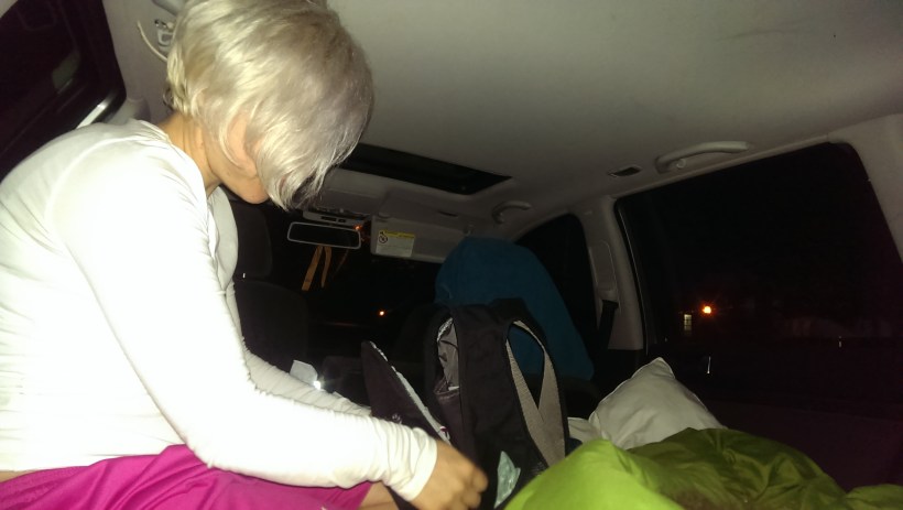 Luces!!!! A las 00:30. Un pick up se para detrás con las luces encendidas. Pues yo no salgo!!. Golpea en la puerta un policía enorme con una linterna, chaleco antibalas, gafas de protección…. Y nos dice que está prohibido dormir en el coche en el pueblo, que podemos ir a otro sitio. Joder!! Es super tarde.