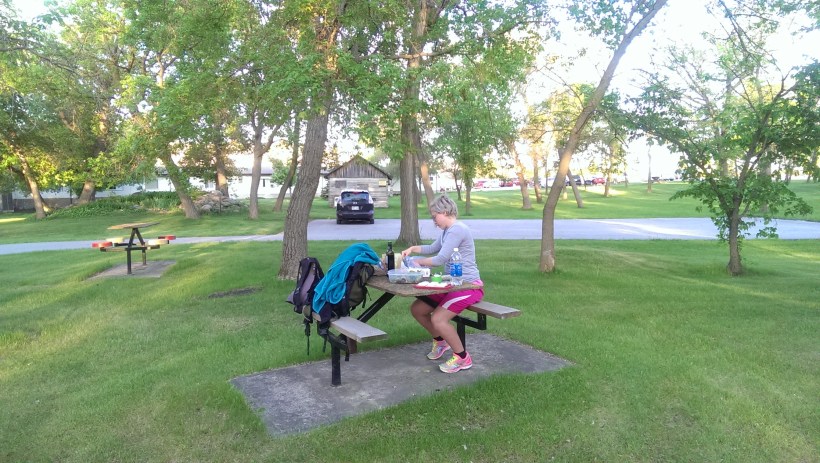 En la mañana del 17 de Junio nos despertamos descansados.Aunque han entrado varios coches al parking, se ha dormido bien. También parece que algunos bichitos hurgaban por debajo del coche. El desayuno en el parque, que por cierto es enorme.