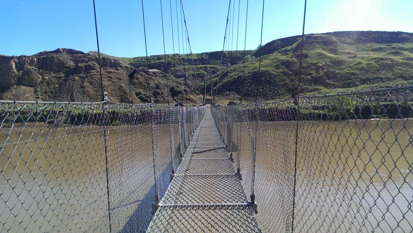 Tras ver las opciones para estacionar y pasar la noche, la mejor parece salir un poco del pueblo y quedarnos junto a la entrada del antiguo puente colgante. Como es histórico, está cortado y no hay nadie por allí.
