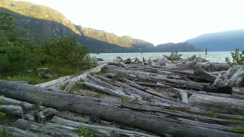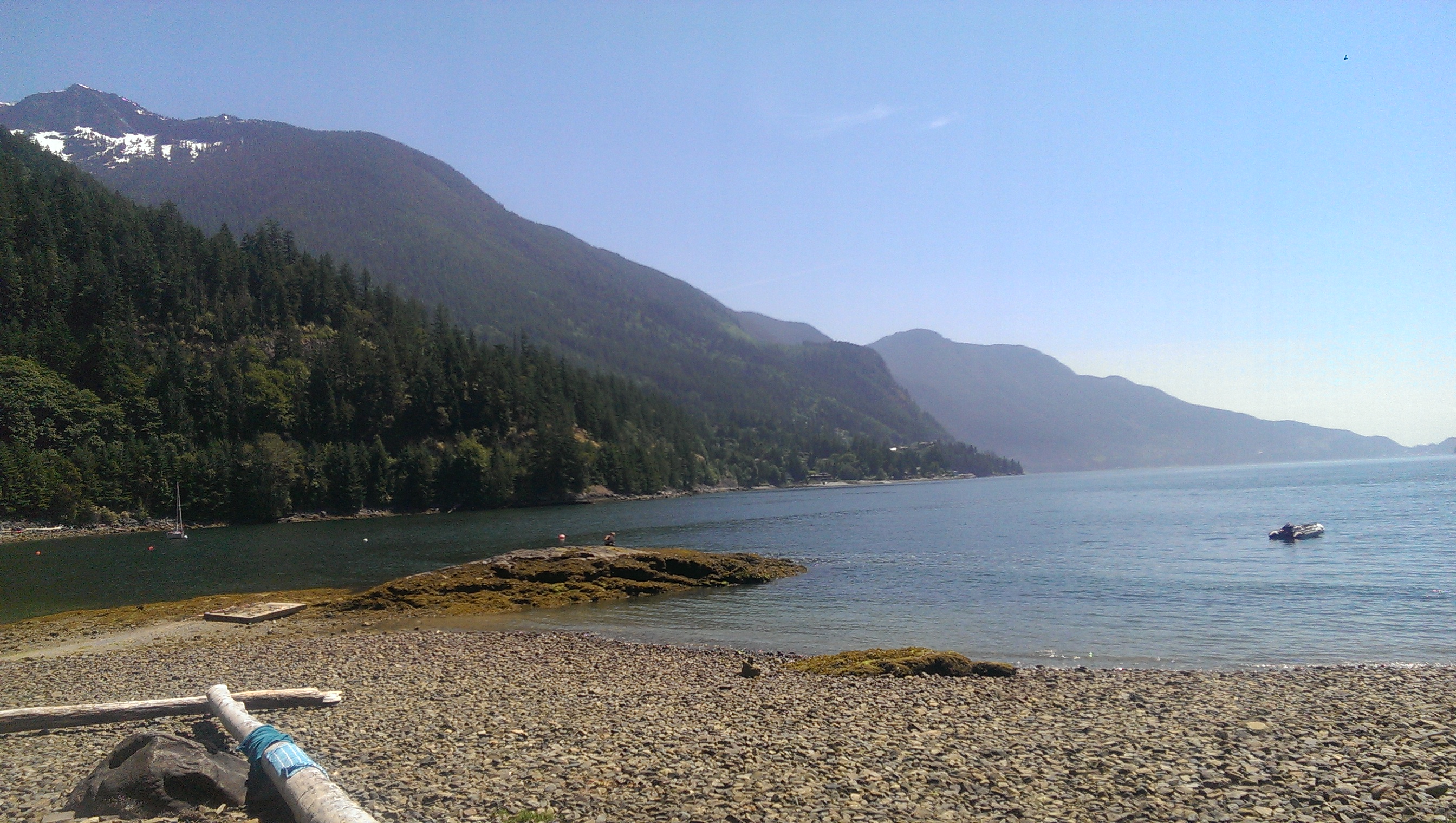 De camino para Vancouver, son unos 60 Km, paramos en “Lyon Bay”, un recoveco que tiene unas pocas casa junto a la playa, en el terreno ganado al bosque. La playa de piedras gordas y el agua está fía de narices, pero con el calorcito del sol y el paisaje se esta de maravilla. Nos quedamos a comer aquí con un pequeño pic-nic.