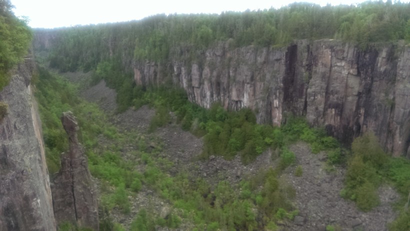 Pasamos de una pradera a un valle que fue un glaciar en el pasado y que recuerda la provincia de Almería pero con mucho más verde. Se ven claramente las vetas de carbón, negras, en las laderas. Vemos primero el puente colgante de acceso a la mina “Star” y después nos acercamos a ver una mina que todavía mantiene la estructura de acceso y railes para extraer el carbón. Entre tanto nos encontramos con algo que Sergio estudio en 3º de BUP y que le preguntaron el un examen sobre ciencias, las “chimeneas de hadas”; unas formaciones rocosas que se crean en este terreno por el paso de la erosión del agua (una piedra plana en el suelo, va lloviendo y el suelo se va diluyendo poco a poco, pero justo debajo de la piedra el suelo queda, por lo que en años se forma única columna de tierra con un sombrero de piedra.